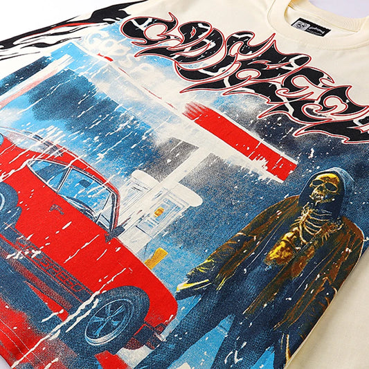 American High Street Retro Godspeed T Shirt Men Red Car Skull Print Long Sleeve Top Tee GOD SPEED T-shirts